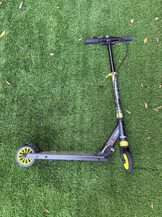 Patinete de estilo infantil con detalles en color verde en buen estado. - Ruedas de color verde. - Manillar negro con puños grises. - Plataforma gris. -Es plegable