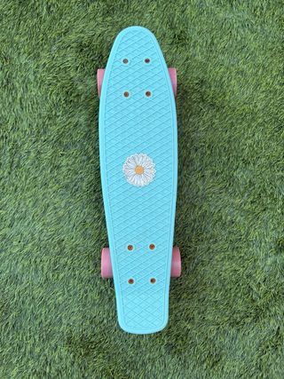 Penny board de color azul con un diseño divertido y ruedas rosas. - Tabla de plástico resistente. - Ruedas de color rosa. - Adhesivo de flor blanca en el centro.
