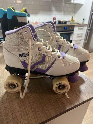 Patines de estilo clásico en color blanco con detalles morados. - Marca: Fila - Diseño de caña alta - Ruedas de color claro