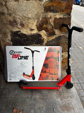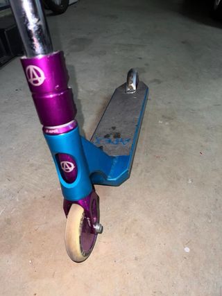 Patinete completo de la marca Apex, tiene unos 2 meses de uso. Se vende por falta de uso, ya que lo compre cuando era niño y en la epoca de scooters me lo compre y se quedo en el parking, no urge. - Manillar color plata con manguitos morados. - Ruedas con goma blanca y lo de dentro morado. - Base azul