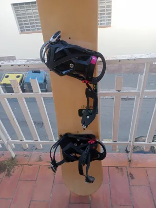 Tabla de snowboard con un diseño llamativo y moderno. - Base negra con detalles en dorado y blanco. - Fijaciones incluidas.