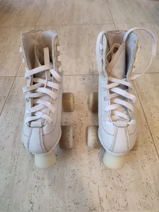 Patines blancos de cuatro ruedas en talla 31. - Cierre con cordones. - Ruedas de color amarillo pálido. - Detalle de logo en la lengüeta. Usados durante unos meses, pero van muy bien, lastima que ya no le caben de talla.