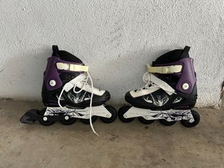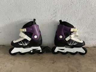 Patines en línea Oxelo en color morado y blanco, talla 38. Diseñados con un estilo moderno y detalles gráficos. - Cierre con cordones y hebillas. - Ruedas de patinaje en línea.