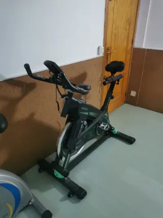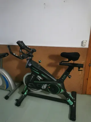 Bicicleta de spinning de la marca Cecotec. - Diseño moderno en negro y verde. - Manillar ajustable. - Sillín acolchado.