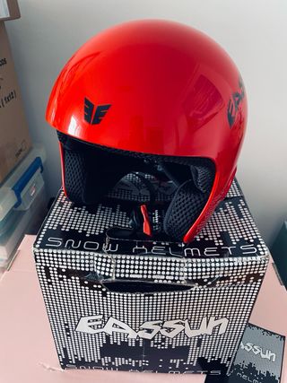 Casco de nieve infantil de color rojo brillante, con un diseño moderno y seguro. - Marca: Eassun - Color: Rojo - Diseño: Infantil - Tipo: Casco de nieve - Homologado C€ - Talla XXS / 48 - 51 cm - Perfectas condiciones nunca se usó - Correa ajustable - Se adaptan perfectamente las gafas de nieve