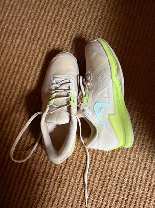 Zapatillas Head Sprint Pro 3.5 para mujer en color beige con detalles en verde lima y azul. - Diseño deportivo. - Cierre con cordones. - Logo de Head en el lateral.