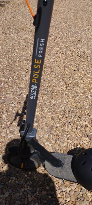 Se vende patinete eléctrico en buen estado, junto con un casco protector. - Patinete eléctrico de color gris y naranja. - Casco de protección de color negro.