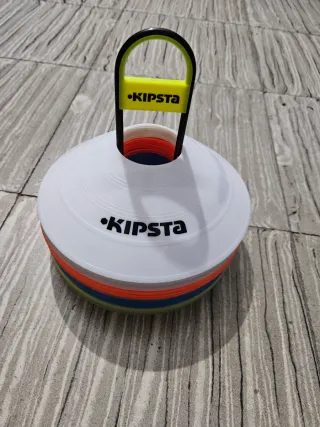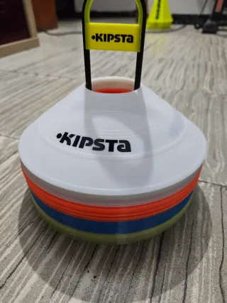 Set de conos Kipsta de varios colores, ideales para entrenamientos deportivos. - Conos apilables para fácil almacenamiento. - Marca: Kipsta. - Colores: Blanco (8), naranja (10), azul (10) y amarillo (8).