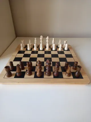 Precioso ajedrez de madera. Las fichas también son de madera. El tablero mide 29,5x29,5cm y 1,5cm de alto. La pieza más pequeña mide 3cm de alto y la más grande 6cm de alto.