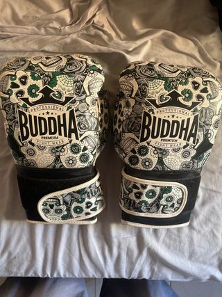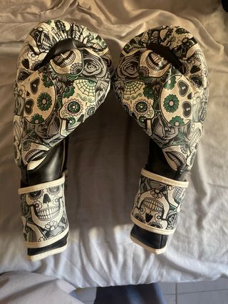 Guantes de boxeo de la marca Buddha con un diseño llamativo de calaveras y flores. Se venden porque me han regalado unos guantes nuevos - Diseño exclusivo de calaveras y rosas. - Cierre de velcro ajustable. - Material de alta calidad. - Muy cuidado - Practicamente nuevos, solo usados en sparring Escucho ofertas, no hago envios