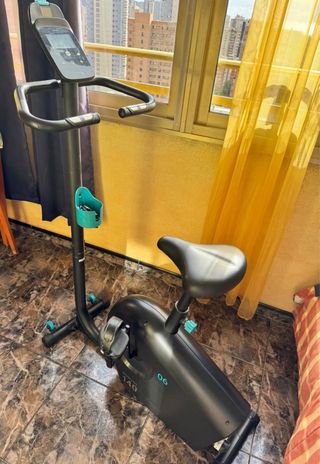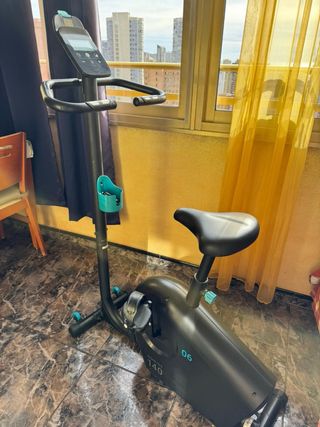 Bicicleta estática de color negro, modelo DOMYOS 140. - Diseño compacto y moderno. - Soporte para botella integrado. - Pantalla digital con información de entrenamiento. Como nueva, usada dos veces.