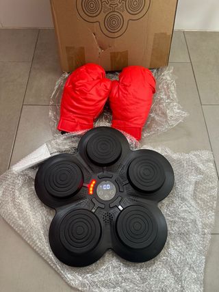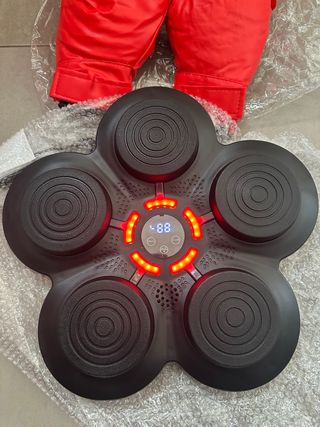 Máquina de boxeo musical con luces LED y pantalla digital. - Diseño en forma de flor. - Superficie de golpeo con círculos concéntricos. - Luces LED rojas. - Pantalla digital que muestra números. NUNCA SE HA USADO. NUEVO SIN ESTRENAR . SOLO ABIERTO PARA LAS FOTOS