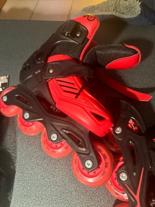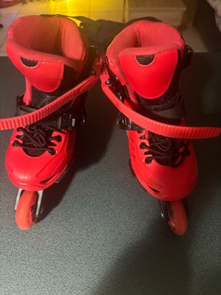 Par de patines en línea de color rojo brillante. Diseñados para ofrecer comodidad y estilo. - Cierre de velcro y cordones. - Ruedas de color naranja. - Interior acolchado.