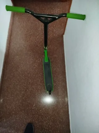 Patinete acrobático de color verde y negro. - Manillar negro. - Plataforma verde. - sin ruedas