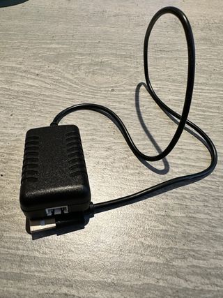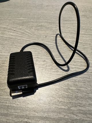 Cargador para baterías de RC. El cargador es de color negro y tiene un diseño compacto. - Cable de alimentación incluido. - Conector de carga.