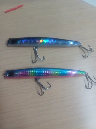 Dos señuelos de pesca de la marca Apia con un diseño llamativo. -Apia punch line 130 - modelo Anglers Utopia -36 gramos - Señuelo plateado con reflejos iridiscentes. - Señuelo con acabado multicolor (rosa, azul, verde). - Ambos señuelos tienen anzuelos triples.