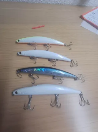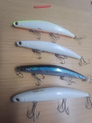 Lote de señuelos de pesca Bainer y Bora. - 1 Señuelo Str blanco con detalles naranjas y amarillos 42 gramos - 2 Señuelo Bainer blancos de 42 gramos - Señuelo Bainer azul plateado 42 gramos