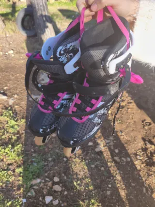 Patines en línea, con un diseño llamativo en color rosa y negro. - Cierre de velcro y cordones. - Ruedas de poliuretano. - Bota ajustable.