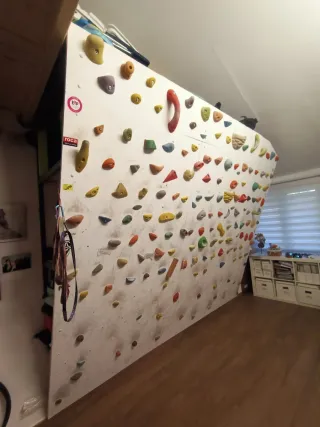 Rocódromo de escalada para uso interior. Perfecto para entrenar y divertirse en casa. - Diseñado para montaje en pared. - Incluye una gran variedad de presas de diferentes formas y tamaños. - Superficie blanca con marcas de uso. Tiene 170 presas de diferentes tamaños. Predomina el tamaño medio de buen agarre. El precio incluye todo, presas, tornillería M10 y 2 tablones y medio de DM de 1'9 de grosor preparados para albergar las presas mediante tuercas rosca pua embutidas por detrás. Los tablones miden 122x244 (x2), 70x244 y 34x244. Regalaría la estructura metálica trasera, compuesta de barras de estantería. Es un roco casero pe