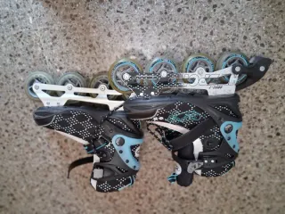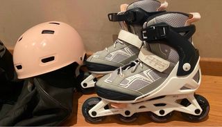 Patines en línea para niña, talla 38. Se encuentran en muy buen estado. - Diseño en color gris y morado. - Cierre de velcro y cordones. - Ruedas de patinaje.