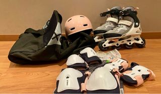 Conjunto de protección y patines - Patines ajustables talla 35-38 - Casco rosa talla S (52-55 cm) - Rodilleras, coderas y muñequeras talla XS - Bolsa de transporte Está practicamente nuevo, no ha tocado la calle.