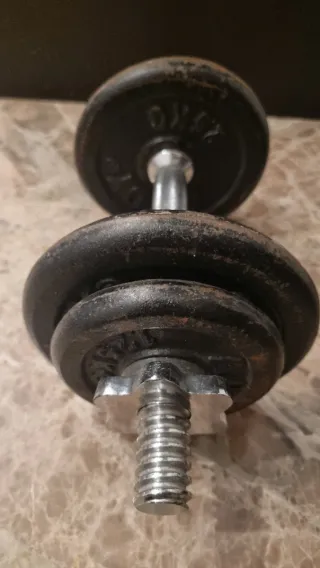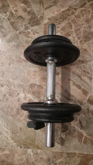 Mancuerna ajustable con discos de peso. - Discos de hierro fundido. - Barra con rosca y cierre de seguridad.