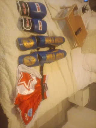 Pack completo de equipación para kick boxing.Lo usé una vez , me costó todo 230 euros. - Guantes de boxeo marca TOP TEN en color azul. - Peto protector para espinillas y empeines en color azul con detalles dorados. - Pantalón corto de kick boxing en color rojo y blanco con detalles de la marca.