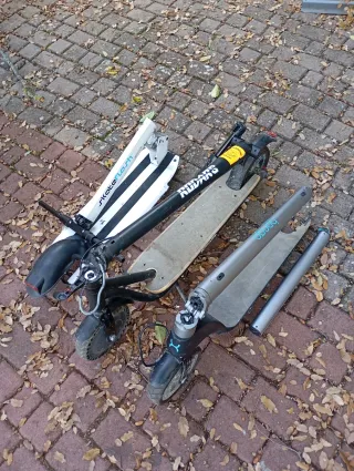 Se vende lote de tres patinetes eléctricos. Se encuentran tal cual se ven en las fotos sirven para piezas o para reparar. Preguntar precio de piezas o cualquier información - Patinete blanco con rayas negras. - Patinete negro con detalles amarillos. - Patinete gris con detalles azules.