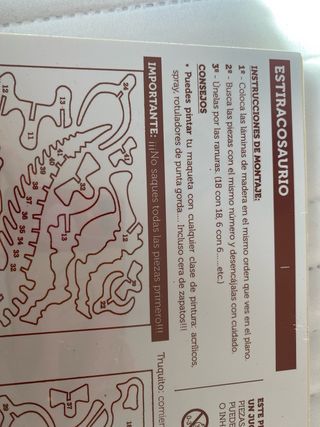 Maqueta de madera de dinosaurio Estiracosaurio, sin abrir. Ideal para montar y pintar. - Contiene piezas pequeñas, no apto para niños menores de 3 años. - Instrucciones de montaje incluidas. - Material: Madera.