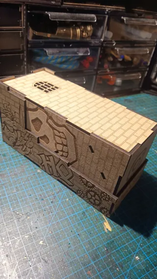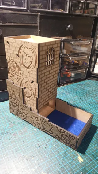 Torre de dados temática de HQ, ideal para juegos de rol y de mesa. Fabricada en madera con detalles grabados. - Diseño de torre con acabado de ladrillo. - Grabados de personajes y elementos de HQ. - Base con fieltro azul para amortiguar los dados. - Mecanismos y engranajes grabados en la base.