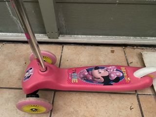 Patinete infantil de tres ruedas con diseño de Minnie Mouse. Ideal para los más pequeños. - Color rosa. - Empuñaduras amarillas. - Ruedas delanteras dobles.