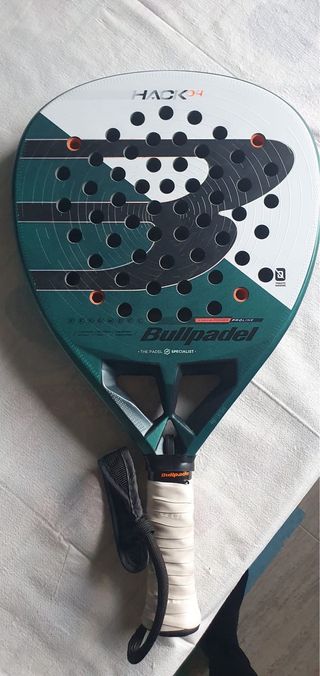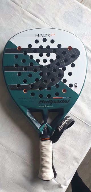 Pala de pádel Bullpadel Hack 04. Tiene un único partido, en perfecto estado! - Diseño con acabado en blanco, verde y negro. - Detalles en color naranja. - Incluye correa de muñeca Bullpadel.