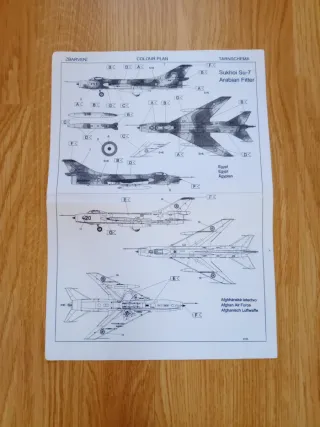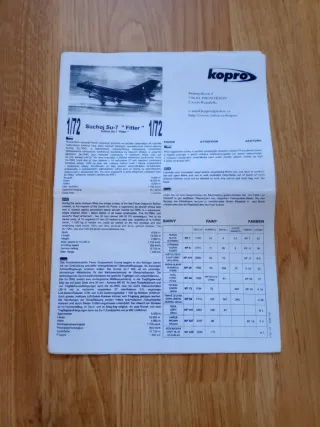 Maqueta a escala 1/72 del avión Sukhoi Su-7 Fitter de Kopro. - Incluye instrucciones de montaje. - Hoja de calcomanías para 3 versiones: Egipto, Afganistán y Argelia. - Referencia: 1/72 Suchoj Su-7 Fitter. - Varias piezas sueltas como se ven en las fotos. - Sin caja.