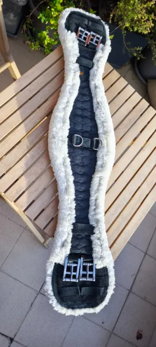 Cincha anatómica de doma en color negro, marca Kentucky, con una longitud de 73 cm. Diseñada para ofrecer comodidad y un ajuste óptimo. - Material exterior de borreguillo sintético. - Hebillas metálicas. - Anillas para acoplar ayudas.