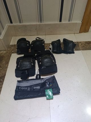 Set de protecciones Oxelo para patinaje o ciclismo. - Incluye rodilleras, coderas y muñequeras. - Talla S. - Color negro. - Cierre con velcro ajustable. - Bolsa de transporte de malla.