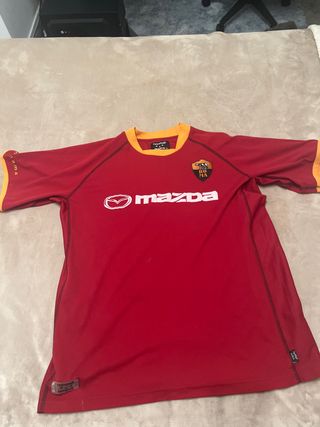 Camiseta de fútbol del AS Roma con patrocinio de Mazda. Diseño clásico en color rojo. - Cuello y mangas con detalles en amarillo. - Escudo del equipo en el pecho. - Logo de Mazda en el frontal.