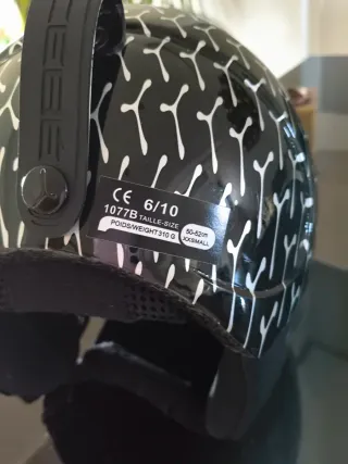 Casco de esquí para jóvenes con un diseño moderno y llamativo. - Patrón geométrico en blanco y negro. - Detalles en rojo y plateado. - Correa ajustable.