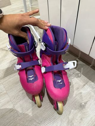 Patines en línea rosas y morados de Decathlon, talla 32-34 (20-21.5 cm). - Marca: Oxelo - Modelo: Play 3 - Diseño infantil con dibujos de mariposas y personaje. - Cierre de velcro y hebilla.