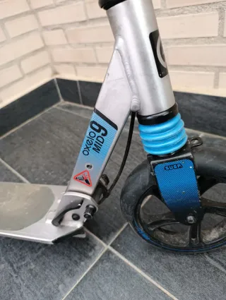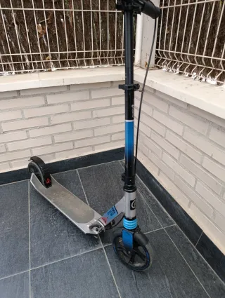 Patinete Oxelo MID 9 en color azul y plateado con un uso normal y funciona perfectamente ruedas,freno - Plataforma ancha para mayor comodidad. - Ruedas de 200 mm para un desplazamiento suave. - Freno trasero. - Manillar ajustable en altura. - Se puede plegar para guardarlo mejor