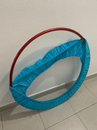 Aro de gimnasia rítmica con funda. - Aro de color rojo con acabado brillante. - Funda de tela azul con pliegues.