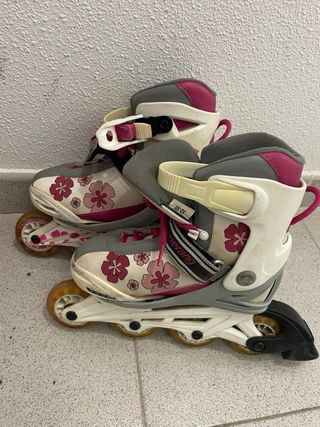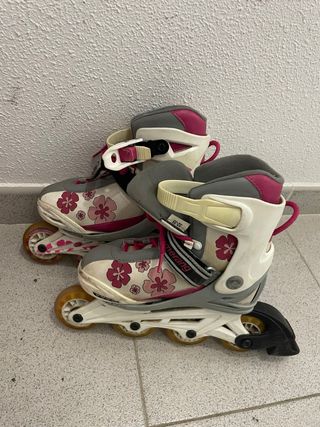 Patines en línea para niña con un bonito diseño floral en tonos rosas y grises. Cuentan con cierre de velcro y cordones para un ajuste seguro. - Diseño floral rosa y blanco. - Talla 32-35. - Cierre de velcro y cordones. - Ruedas amarillas.