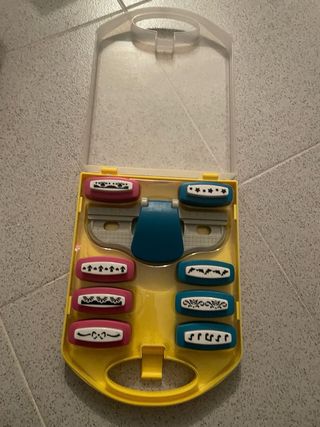 Set de troqueladoras para manualidades infantiles, ideal para decorar papel. - Incluye estuche organizador amarillo. - Variedad de diseños: estrellas, flechas, lazos, motivos florales y notas musicales. - Mecanismo de corte sencillo.