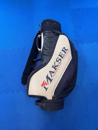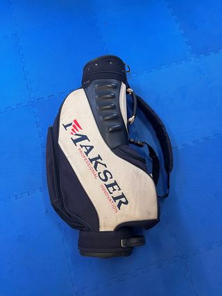 Funda de palos de golf de la marca Makser. - Diseño en color blanco y azul marino. - Detalle de logo y texto PROFESSIONAL INNOVATION en color rojo y negro. - Asa superior y correa para transporte.