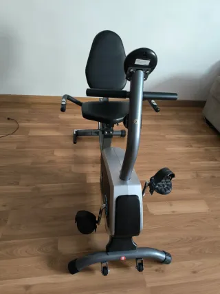 Bicicleta estática de la marca ISE, ideal para entrenamientos en casa. Su diseño permite una posición cómoda para el ejercicio. - Asiento ergonómico con respaldo. - Pedales con correas ajustables. - Manillar con agarres acolchados. - Ruedas de transporte en la base.