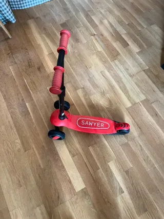 Patinete de tres ruedas en color rojo, con el nombre 'Sawyer' en la base. - Base antideslizante. - Ruedas de goma. - Puños de goma para un mejor agarre.