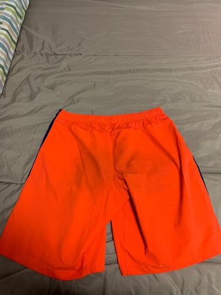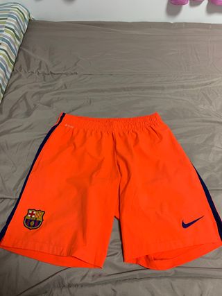 Pantalones cortos del FC Barcelona de la temporada 2014/2015. - Color naranja vibrante. - Escudo del FC Barcelona bordado. - Logo de Nike. - Banda lateral azul marino. - Talla L