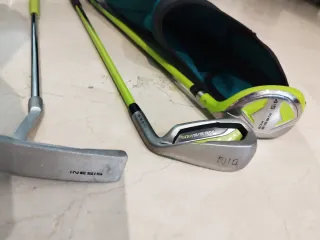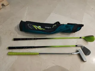 Set de palos de golf Inesis para niños de 5 a 8 años. Incluye bolsa de transporte. - Bolsa de golf con diseño de cocodrilo. - Palo de golf tipo driver. - Palo de golf tipo hierro. - Palo de golf tipo putter.
