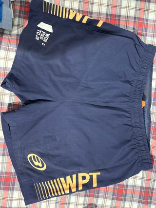 Bermudas de pádel de la World Padel Tour. - Color azul marino. - Detalle de logo WPT y diseño de líneas en color naranja. - Cintura elástica y cordones - están en buen estado pero como el logo esta deteriorado rebajo el estado y precio