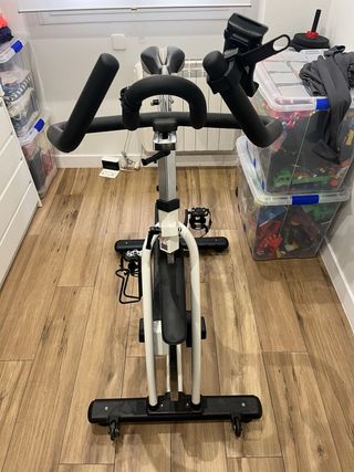 Bicicleta de spinning profesional Telju, ideal para entrenamientos en casa. - Diseño robusto y estable. - Manillar ajustable. - Sillín ergonómico. - Pedales con agarre. - Ruedas para fácil transporte. Rueda de 22kg para un pedaleo real Soporta hasta 180 kg de usuario. Patas regulables