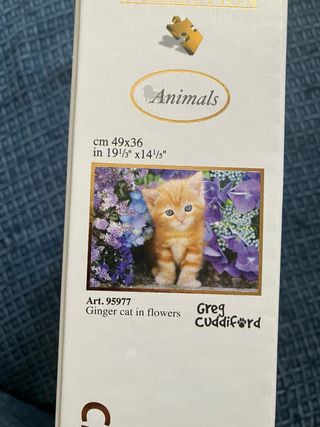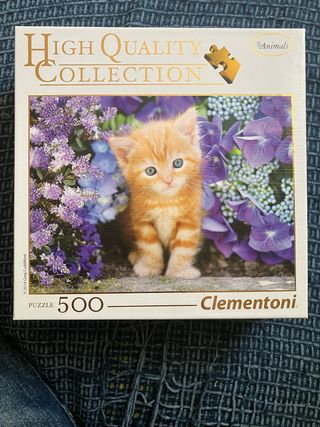 Puzzle de 500 piezas de la colección High Quality Collection de Clementoni. La imagen muestra un gatito anaranjado entre flores. - En perfecto estado, hecho solo dos veces. - El precio es fijo, pero te hago rebaja si te llevas más de un puzzle. - Se puede cambiar por otro similar. - En Madrid y alrededores puedo entregarlo en mano